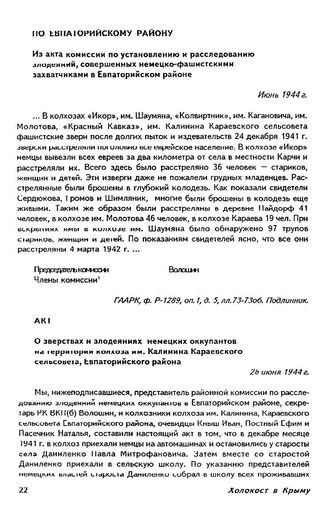 Акты Крымской республиканской комиссии ЧГК. Из акта комиссии по установлению и расследованию злодеяний, совершенных немецко-фашистскими захватчиками в Евпаторийском районе. Июнь 1944 г.