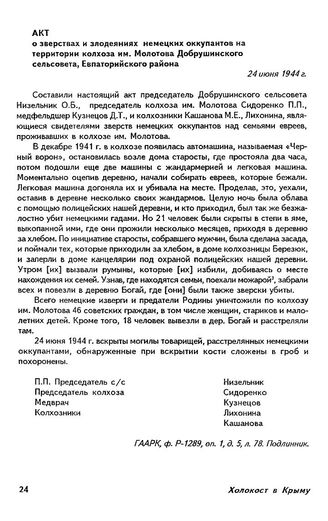 Акты Крымской республиканской комиссии ЧГК. Акт о зверствах и злодеяниях немецких оккупантов на территории колхоза им. Молотова Добрушинского сельсовета, Евпаторийского района. 24 июня 1944 г. // ГААРК, ф. Р-1289, оп. 1, д. 5, л. 78. Подлинник.