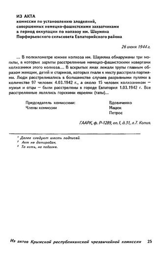 Акты Крымской республиканской комиссии ЧГК. Из акта комиссии по установлению злодеяний, совершенных немецко-фашистскими захватчиками в период оккупации по колхозу им. Шаумяна Порфирьевского сельсовета Евпаторийского района. 26 июня 1944 г. // ГААРК, ф. P-1289, оп. 1, д. 31, л. 7. Копия.