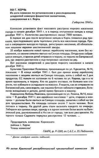 Акты Крымской республиканской комиссии ЧГК. Из акта комиссии по установлению и расследованию злодеяний немецко-фашистских захватчиков, совершенных в г. Керчь. 2 августа 1944 г. // ГААРК, ф. P-1289, оп. 1, д. 2, л. 35. Подлинник.