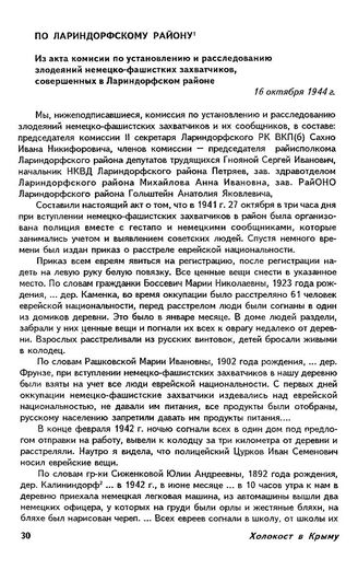 Акты Крымской республиканской комиссии ЧГК. Из акта комиссии по установлению и расследованию злодеяний немецко-фашистских захватчиков, совершенных в Лариндорфском районе. 16 октября 1944 г.