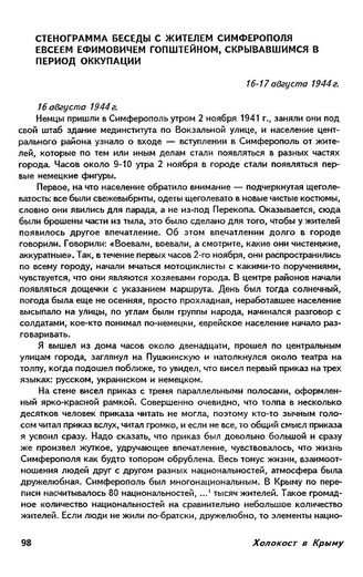 Стенограмма беседы с жителем Симферополя Евсеем Ефимовичем Гопштейном, скрывавшимся в период оккупации. 16-17 августа 1944 г. // ГААРК, ф. П-156, оп. 1, д. 37, лл. 71-106. Подлинник.
