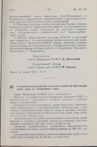Постановление Совета Министров РСФСР. О направлении развития сельского хозяйства Краснодарского края на ближайшие годы. 19 января 1960 г. № 90