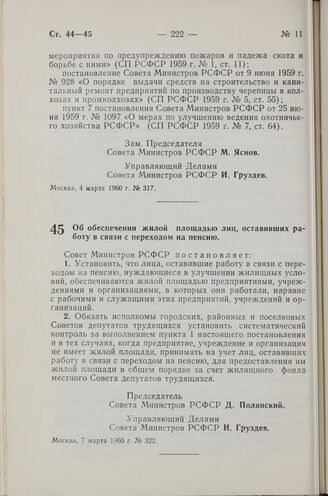 Постановление Совета Министров РСФСР. Об обеспечении жилой площадью лиц, оставивших работу в связи с переходом на пенсию. 7 марта 1960 г. № 322