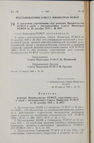 Постановление Совета Министров РСФСР. О признании утратившими силу решений Правительства РСФСР в связи с постановлением Совета Министров РСФСР от 29 декабря 1959 г. № 2027. 15 апреля 1960 г. № 531