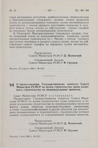 Постановление Совета Министров РСФСР. О предоставлении Государственному комитету Совета Министров РСФСР по делам строительства права разрешать строительство по индивидуальным проектам. 9 мая 1960 г. № 653