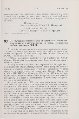 Постановление Совета Министров РСФСР. Об улучшении использования специалистов, оканчивающих вечерние и заочные высшие и средние специальные учебные заведения РСФСР. 19 мая 1960 г. № 713
