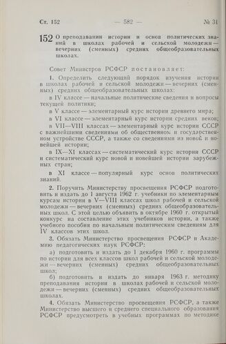 Постановление Совета Министров РСФСР. О преподавании истории и основ политических знаний в школах рабочей и сельской молодежи — вечерних (сменных) средних общеобразовательных школах. 10 сентября 1960 г. № 1412