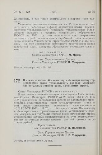 Постановление Совета Министров РСФСР. О предоставлении Московскому и Ленинградскому горисполкомам права устанавливать порядок утверждения титульных списков вновь начинаемых строек. 18 октября 1960 г. № 1575