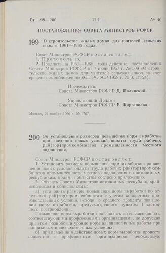 Постановление Совета Министров РСФСР. О строительстве жилых домов для учителей сельских школ в 1961-1965 годах. 24 ноября 1960 г. № 1767