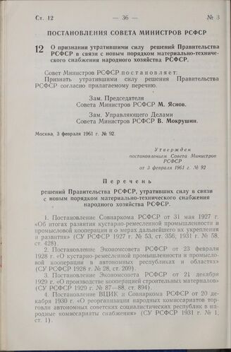 Постановление Совета Министров РСФСР. О признании утратившими силу решений Правительства РСФСР в связи с новым порядком материально-технического снабжения народного хозяйства РСФСР. 3 февраля 1961 г. № 92