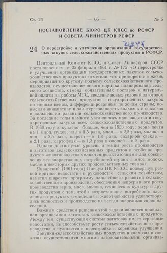 Постановление Бюро ЦК КПСС по РСФСР и Совета Министров РСФСР. О перестройке и улучшении организации государственных закупок сельскохозяйственных продуктов в РСФСР. 17 марта 1961 г. № 262