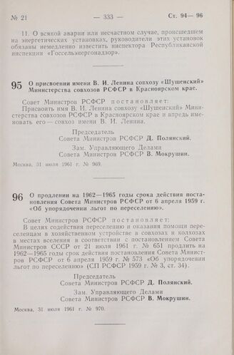 Постановление Совета Министров РСФСР. О продлении на 1962-1965 годы срока действия постановления Совета Министров РСФСР от 6 апреля 1959 г. «Об упорядочении льгот по переселению». 31 июля 1961 г. № 970