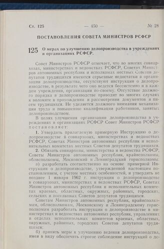 Постановление Совета Министров РСФСР. О мерах по улучшению делопроизводства в учреждениях и организациях РСФСР. 30 сентября 1961 г. № 1238