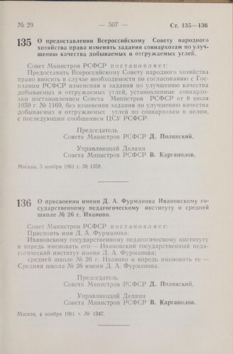 Постановление Совета Министров РСФСР. О предоставлении Всероссийскому Совету народного хозяйства права изменять задания совнархозам по улучшению качества добываемых и отгружаемых углей. 3 ноября 1961 г. № 1358