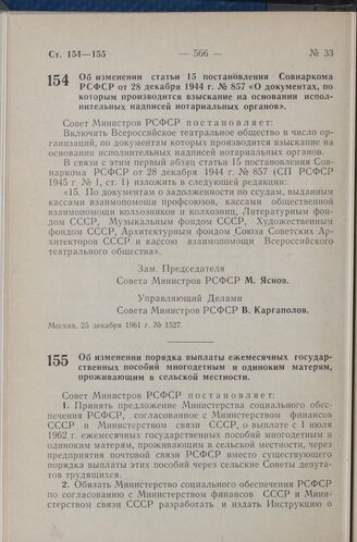 Главная Собрание законов и распоряжений правительства РСФСР и СССР Собрание законов и распоряжений Рабоче-Крестьянского Правительства ... Собрание постановлений правительства РСФСР за 1961 г. № 1-33 Документы Постановление Совета Министров РСФСР. Об изменении статьи 15 постан...