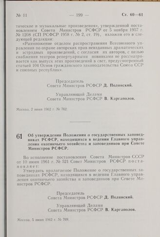 Об утверждении Положения о государственных заповедниках РСФСР, находящихся в ведении Главного управления охотничьего хозяйства и заповедников при Совете Министров РСФСР. Постановление Совета Министров РСФСР. 5 июня 1962 г. № 769