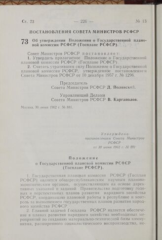 Об утверждении Положения о Государственной плановой комиссии РСФСР (Госплане РСФСР). Постановление Совета Министров РСФСР. 30 июня 1962 г. № 881