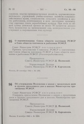 Об утверждении Положения о школе с продленным днем и группах продленного дня в школах Министерства просвещения РСФСР. Постановление Совета Министров РСФСР. 3 октября 1962 г. № 1310