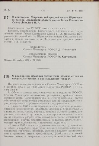 О расширении практики обозначения розничных цен на продовольственных и промышленных товарах. Постановление Совета Министров РСФСР. 26 ноября 1962 г. № 1560