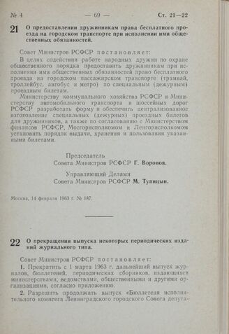 Постановление Совета Министров РСФСР. О предоставлении дружинникам права бесплатного проезда на городском транспорте при исполнении ими общественных обязанностей. 14 февраля 1963 г. № 187