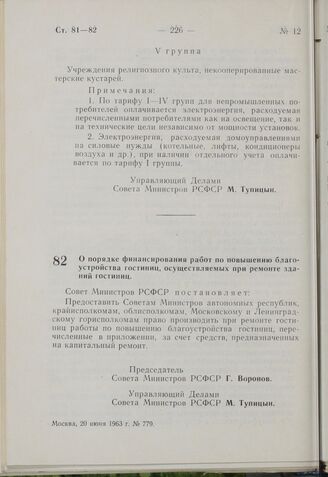 Постановление Совета Министров РСФСР. О порядке финансирования работ по повышению благоустройства гостиниц, осуществляемых при ремонте зданий гостиниц. 20 июня 1963 г. № 779