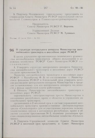 Постановление Совета Министров РСФСР. О структуре центрального аппарата Министерства автомобильного транспорта и шоссейных дорог РСФСР. 31 июля 1963 г. № 938