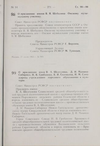 Постановление Совета Министров РСФСР. О присвоении имен В.А. Шелгунова, Д.Н. Мамина-Сибиряка, Н.В. Грибанова, В.И. Соловьева, Н.М. Санджирова учреждениям народного образования и культуры. 31 июля 1963 г. № 937