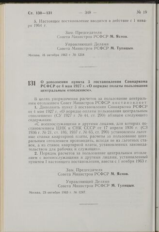 Постановление Совета Министров РСФСР. О дополнении пункта 3 постановления Совнаркома РСФСР от 4 мая 1927 г. «О порядке оплаты пользования центральным отоплением». 23 октября 1963 г. № 1247