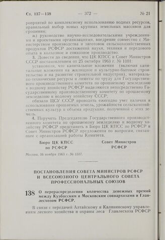 Постановление Совета Министров РСФСР и Всесоюзного Центрального Совета Профессиональных Союзов. О перераспределении количества денежных премий между Кузбасским и Московским совнархозами и Главлесхозом РСФСР. 15 ноября 1963 г. № 1319