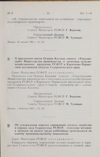 Постановление Совета Министров РСФСР. О присвоении имени Османа Касаева совхозу «Учкуланский» Министерства производства и заготовок сельскохозяйственных продуктов РСФСР в Карачаево-Черкесской автономной области Ставропольского края. 1 февраля 1965 г. № 180