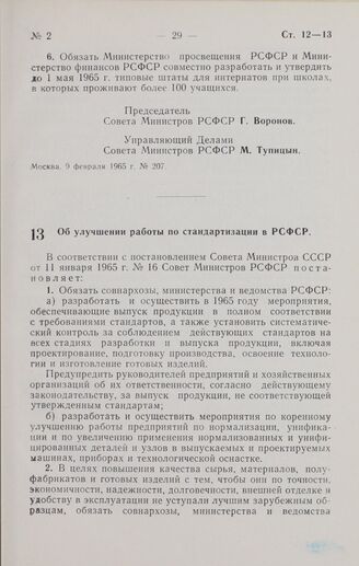 Постановление Совета Министров РСФСР. Об улучшении работы по стандартизации в РСФСР. 12 февраля 1965 г. № 224