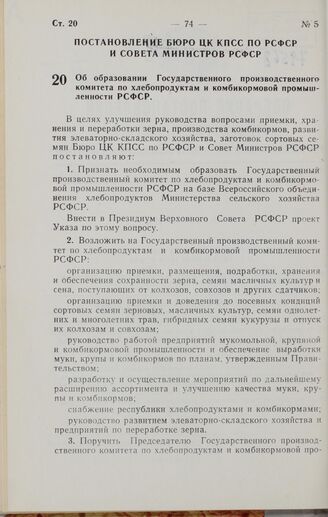 Постановление Бюро ЦК КПСС по РСФСР и Совета Министров РСФСР. Об образовании Государственного производственного комитета по хлебопродуктам и комбикормовой промышленности РСФСР. 24 марта 1965 г. № 388