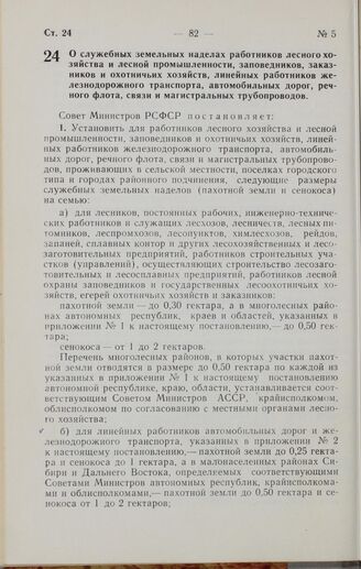 Главная Собрание законов и распоряжений правительства РСФСР и СССР Собрание законов и распоряжений Рабоче-Крестьянского Правительства ... Собрание постановлений правительства РСФСР за 1965 г. № 1-26 Документы Постановление Совета Министров РСФСР. О служебных земельных наделах...