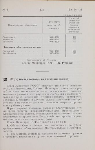 Постановление Совета Министров РСФСР. Об улучшении торговли на колхозных рынках. 17 апреля 1965 г. № 478