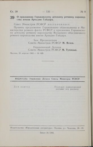 Постановление Совета Министров РСФСР. О присвоении Горьковскому детскому речному пароходству имени Аркадия Гайдара. 20 апреля 1965 г. № 489