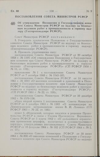 Постановление Совета Министров РСФСР. Об утверждении Положения о Государственном комитете Совета Министров РСФСР по надзору за безопасным ведением работ в промышленности и горному надзору (Госгортехнадзоре РСФСР). 21 апреля 1965 г. № 492