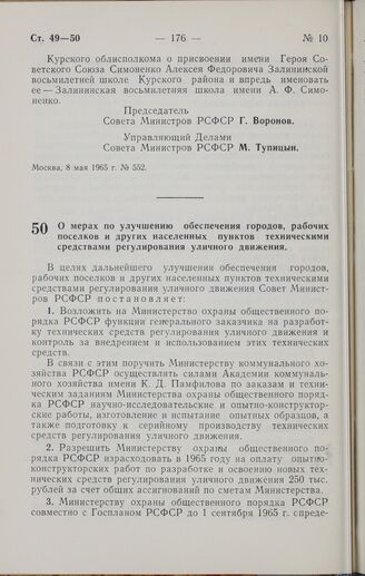 Постановление Совета Министров РСФСР. О мерах по улучшению обеспечения городов, рабочих поселков и других населенных пунктов техническими средствами регулирования уличного движения. 10 мая 1965 г. № 554