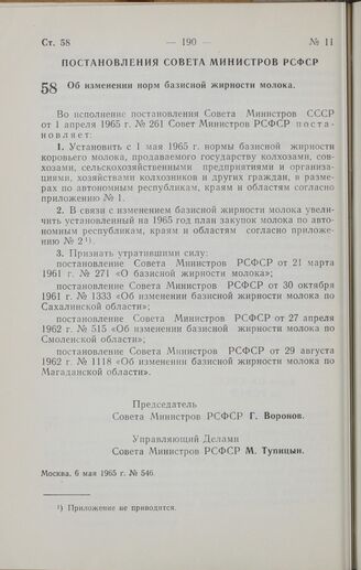 Постановление Совета Министров РСФСР. Об изменении норм базисной жирности молока. 6 мая 1965 г. № 546