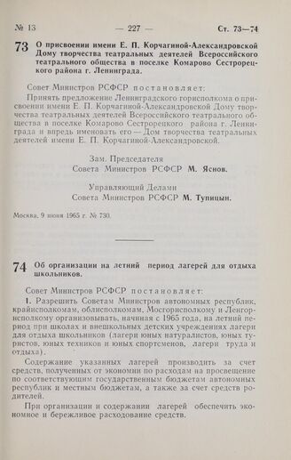 Постановление Совета Министров РСФСР. Об организации на летний период лагерей для отдыха школьников. 10 июня 1965 г. № 733