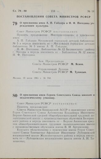 Постановление Совета Министров РСФСР. О присвоении имен А.П. Гайдара и Н.Ф. Погодина учреждениям культуры. 19 июня 1965 г. № 768