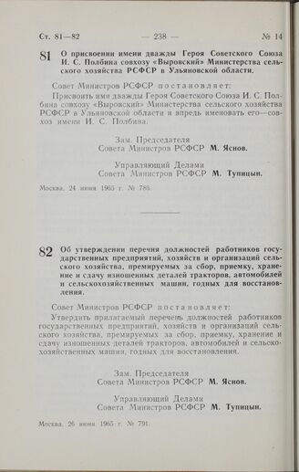 Главная Собрание законов и распоряжений правительства РСФСР и СССР Собрание законов и распоряжений Рабоче-Крестьянского Правительства ... Собрание постановлений правительства РСФСР за 1965 г. № 1-26 Документы Постановление Совета Министров РСФСР. Об утверждении перечня должно...