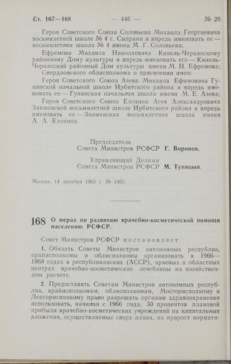 Постановление Совета Министров РСФСР. О мерах по развитию врачебно-косметической помощи населению РСФСР. 15 декабря 1965 г. № 1407