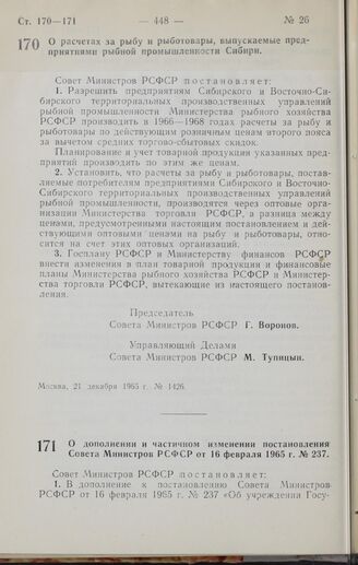 Постановление Совета Министров РСФСР. О расчетах за рыбу и рыботовары, выпускаемые предприятиями рыбной промышленности Сибири. 21 декабря 1965 г. № 1426