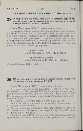 Постановление Совета Министров РСФСР. Об организации Калмыцкого педагогического института Министерства просвещения РСФСР. 21 февраля 1964 г. № 228