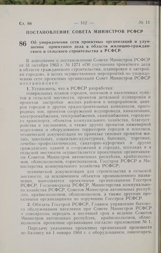 Постановление Совета Министров РСФСР. Об упорядочении сети проектных организаций и улучшении проектного дела в области жилищно-гражданского и сельского строительства в РСФСР. 26 июня 1964 г. № 778