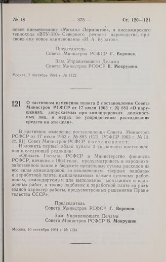 Постановление Совета Министров РСФСР. О частичном изменении пункта 2 постановления Совета Министров РСФСР от 17 июля 1963 г. № 883 «О нарушениях, допускаемых при командировках должностных лиц, и мерах по упорядочению расходования средств на эти це...