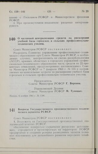 Постановление Совета Министров РСФСР. О частичной централизации средств на расширение учебной базы городских и сельских профессионально-технических училищ. 6 ноября 1964 г. № 1386