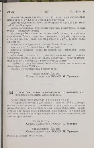 Постановление Совета Министров РСФСР. О размерах платы за пользование служебными и дежурными легковыми автомобилями. 23 декабря 1964 г. № 1597