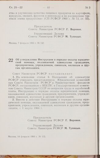 Главная Собрание законов и распоряжений правительства РСФСР и СССР Собрание законов и распоряжений Рабоче-Крестьянского Правительства ... Собрание постановлений правительства РСФСР за 1966 г. Собрание постановлений правительства РСФСР за 1966 г. № 1-18 Документы Постановление Совета Министров РСФСР. Об утверждении Инструкции о п...